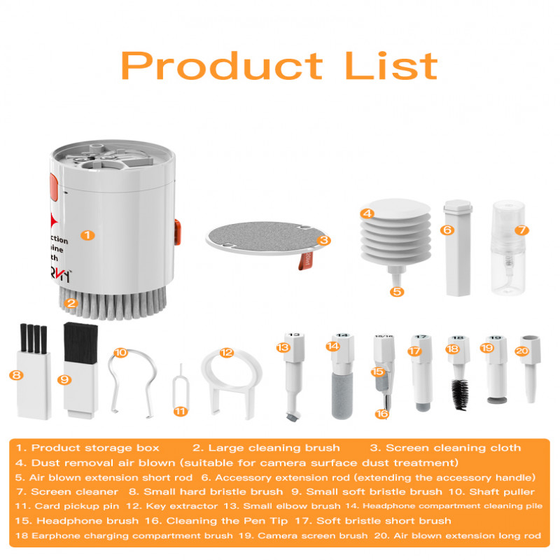 - 20 أداة متخصصة: تشمل أدوات لتنظيف الشاشات، إزالة الغبار، وتنظيف الأجزاء الصغيرة مثل سماعات الأذن ومنافذ الهواتف.